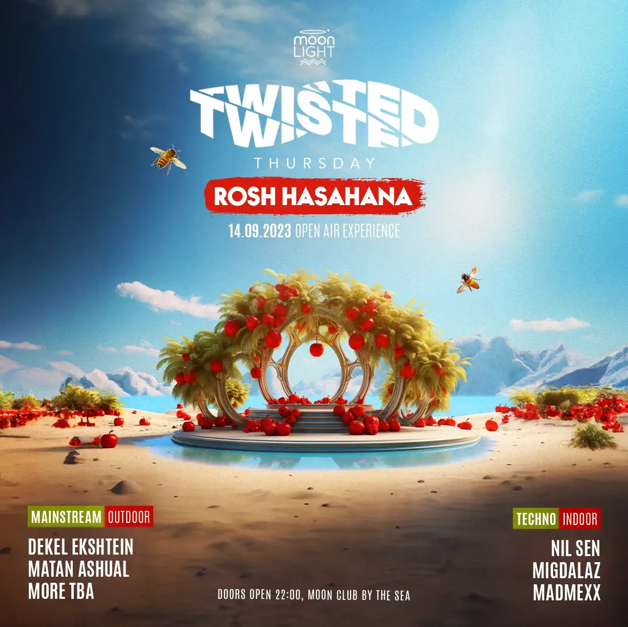 לבושים בלבן עם אווירה משפחתית עם מוזיקת מיינסטרים טהורה במתקן האופן אייר שלנו ועם בוילר רום של טכנו עם האומנים העולים .